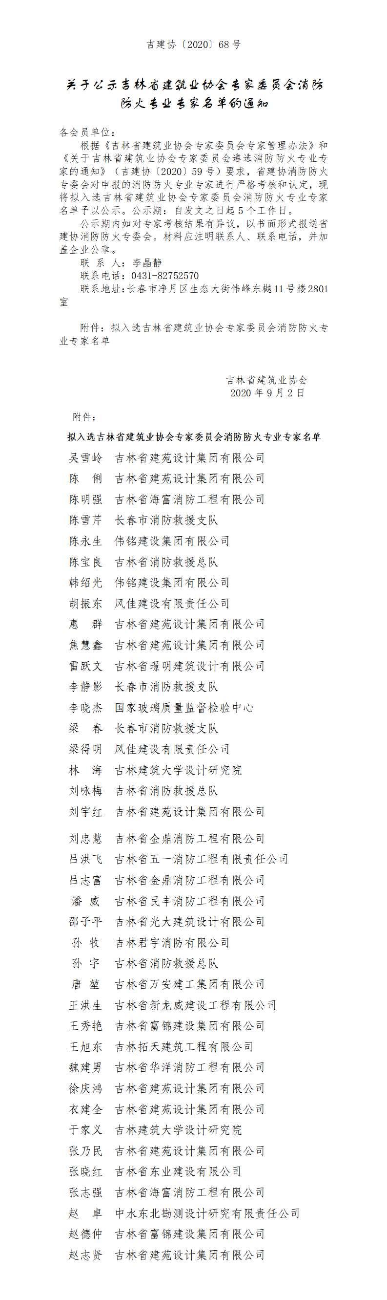 关于公示吉林省建筑业协会专家委员会消防防火专业专家名单的通知